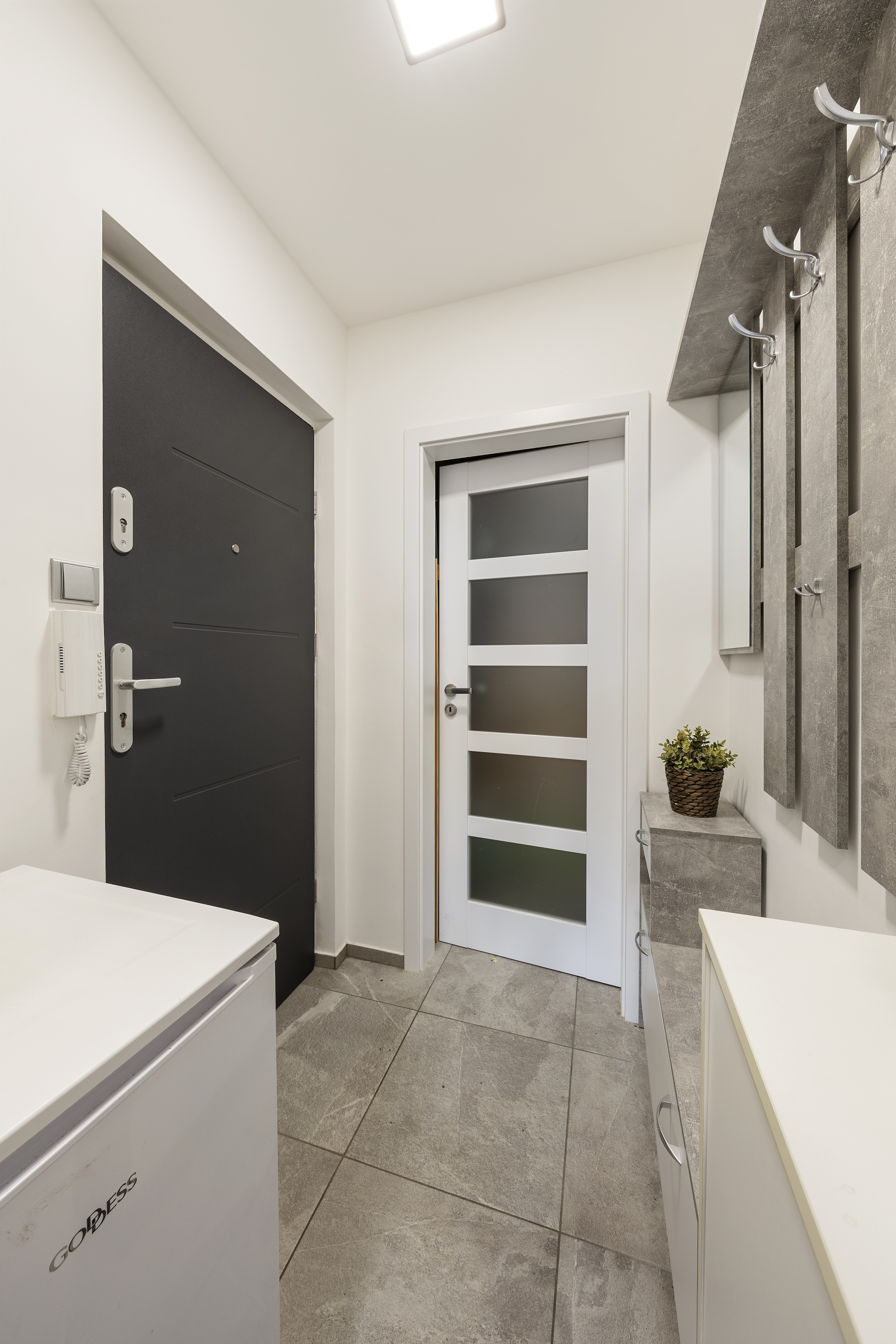 Součástí rekonstrukce byly nové rozvody elektřiny, zděné jádro, podlahy, interiérové dveře i bezpečnostní vstupní dveře. Vytápění bytu je ústřední dálkové.