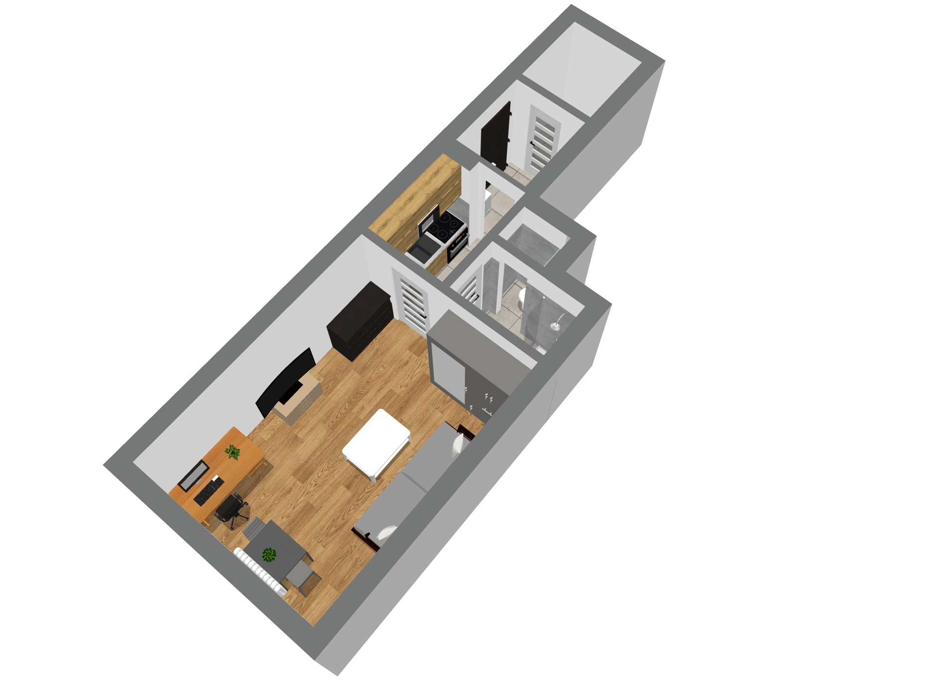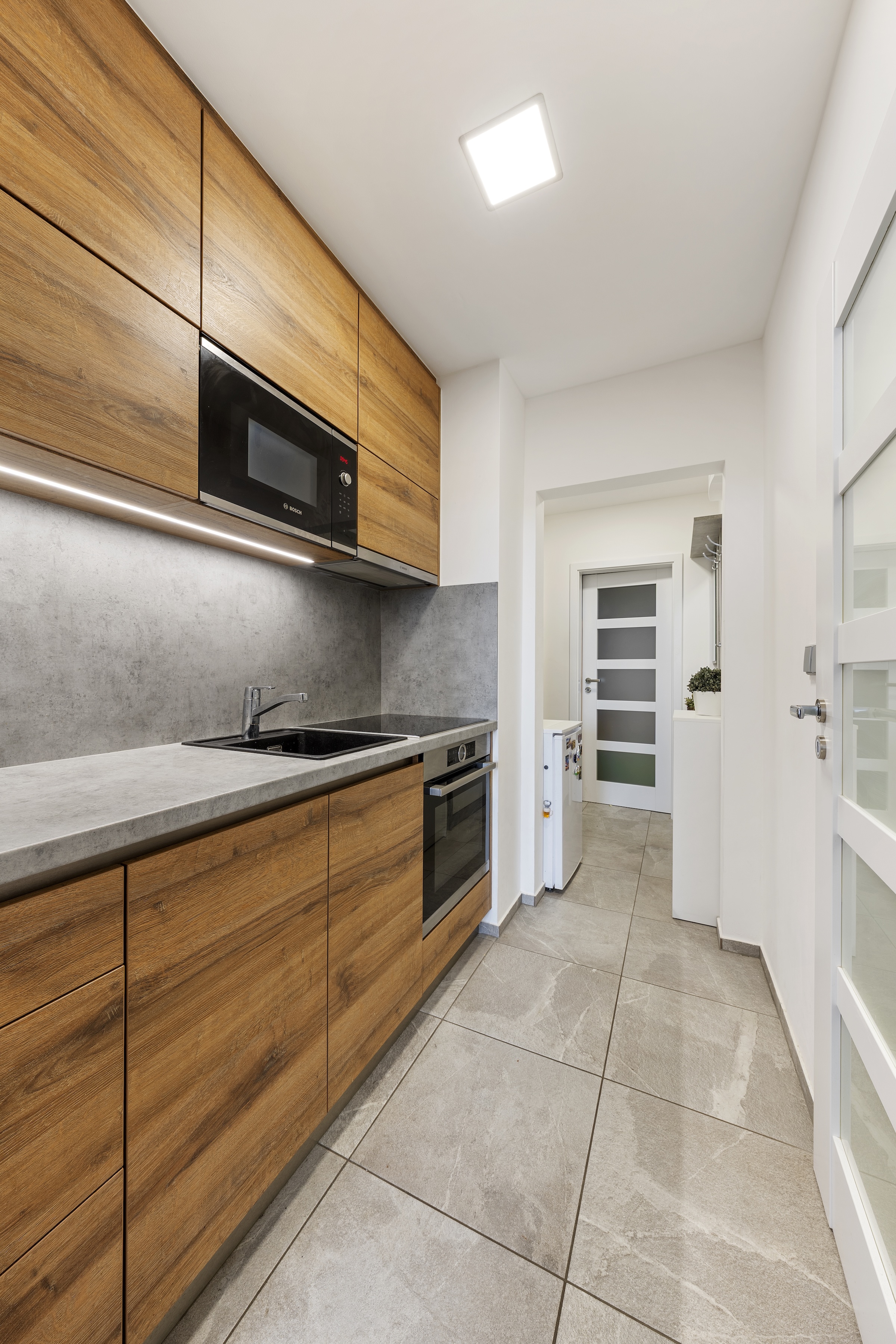 Kuchyně je samostatná a vybavená linkou na míru včetně vestavěných spotřebičů značky BOSCH. Koupelna je řešena prakticky – sprchový kout, toaleta a prostor pro pračku.