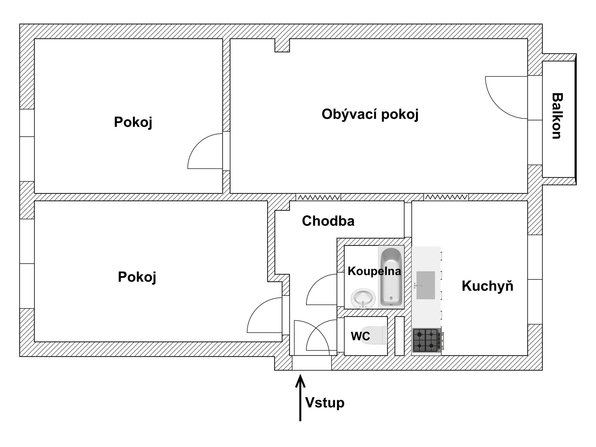 Byt je velmi světlý a příjemně dispozičně řešený. Kuchyně a obývací pokoj jsou orientované na západ, dva samostatné pokoje směřují na východ. Z obývacího pokoje je vstup na balkon, ideální pro ranní kávu nebo večerní relax.