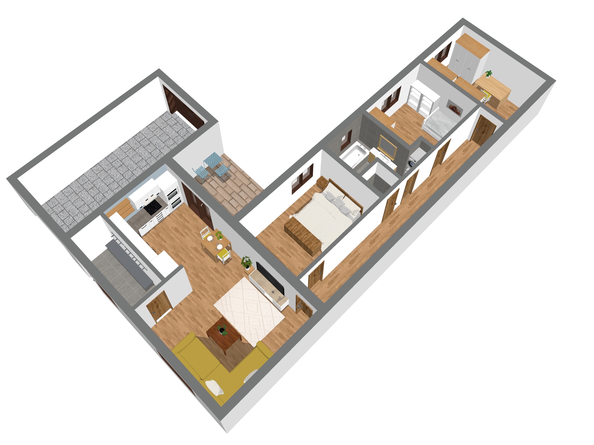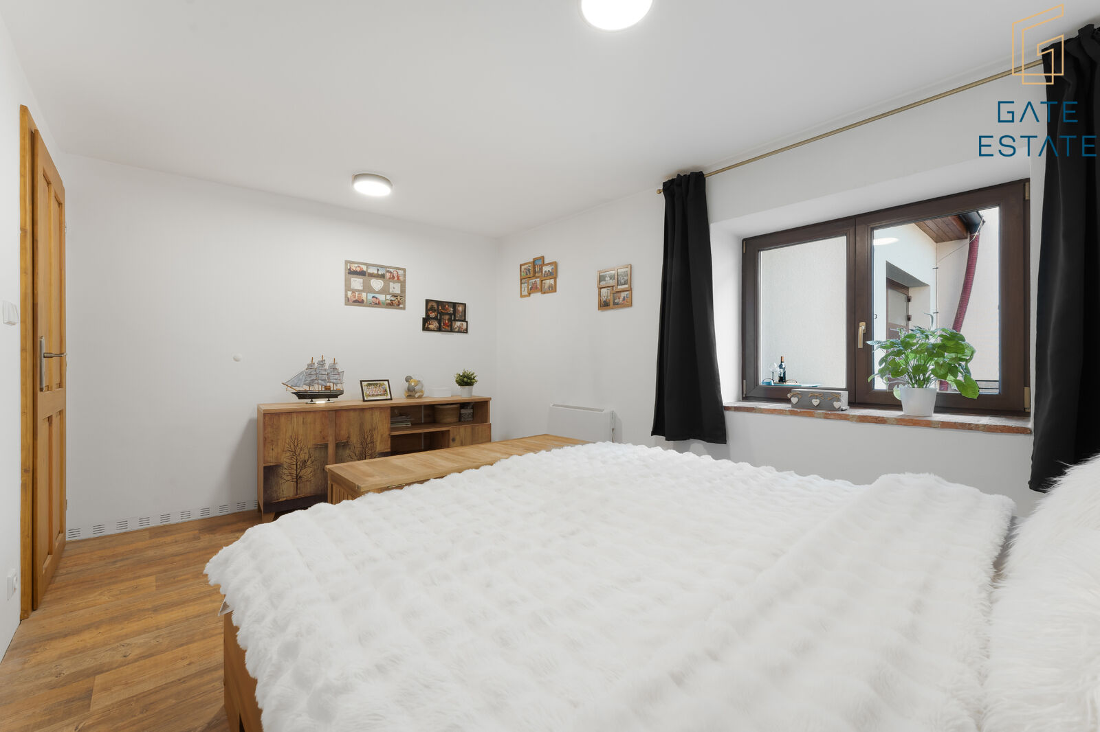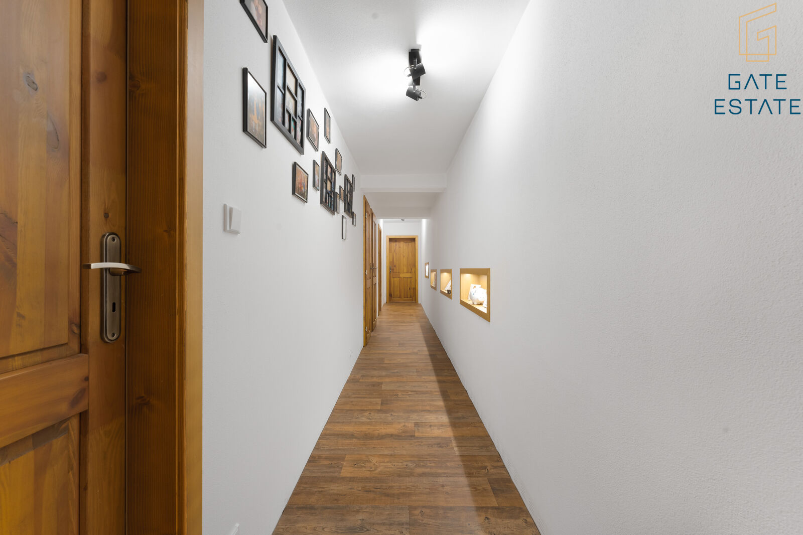 Dispozice domu je řešena prakticky - do všech pokojů se vstupuje z centrální chodby, přičemž obývací pokoj je přístupný přímo ze vstupní předsíně. Díky tomu je oddělena klidová část domu od hlavního obytného prostoru a celý dům působí logicky a funkčně (viz půdorys). Interiér je navíc vkusně sladěný a působí útulně. Kombinace dřeva, světlých tónů a moderních prvků vytváří prostor, ve kterém se budete cítit dobře od prvního okamžiku.