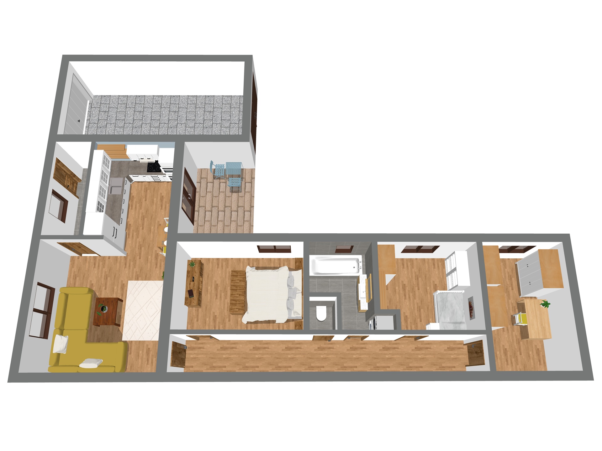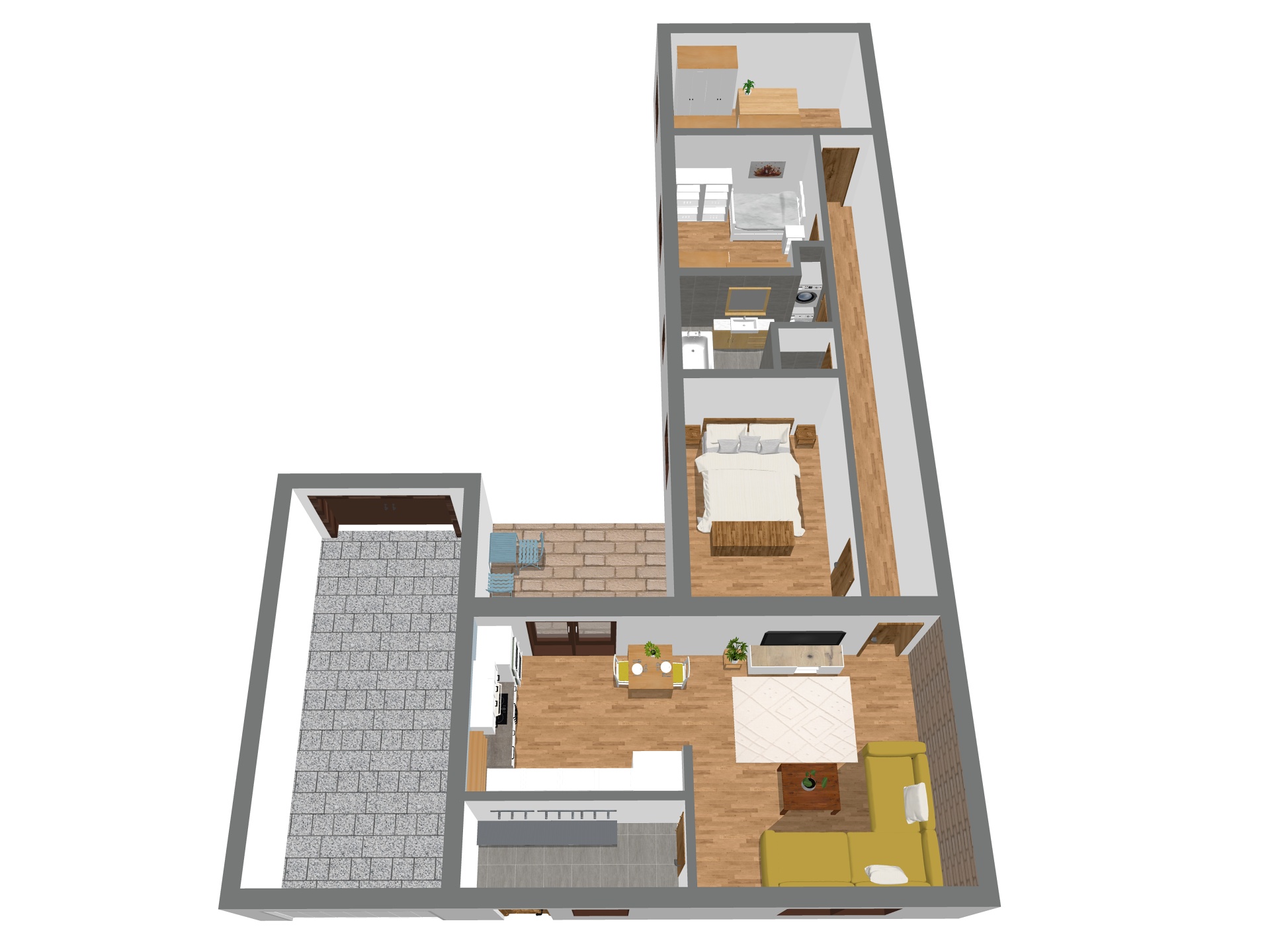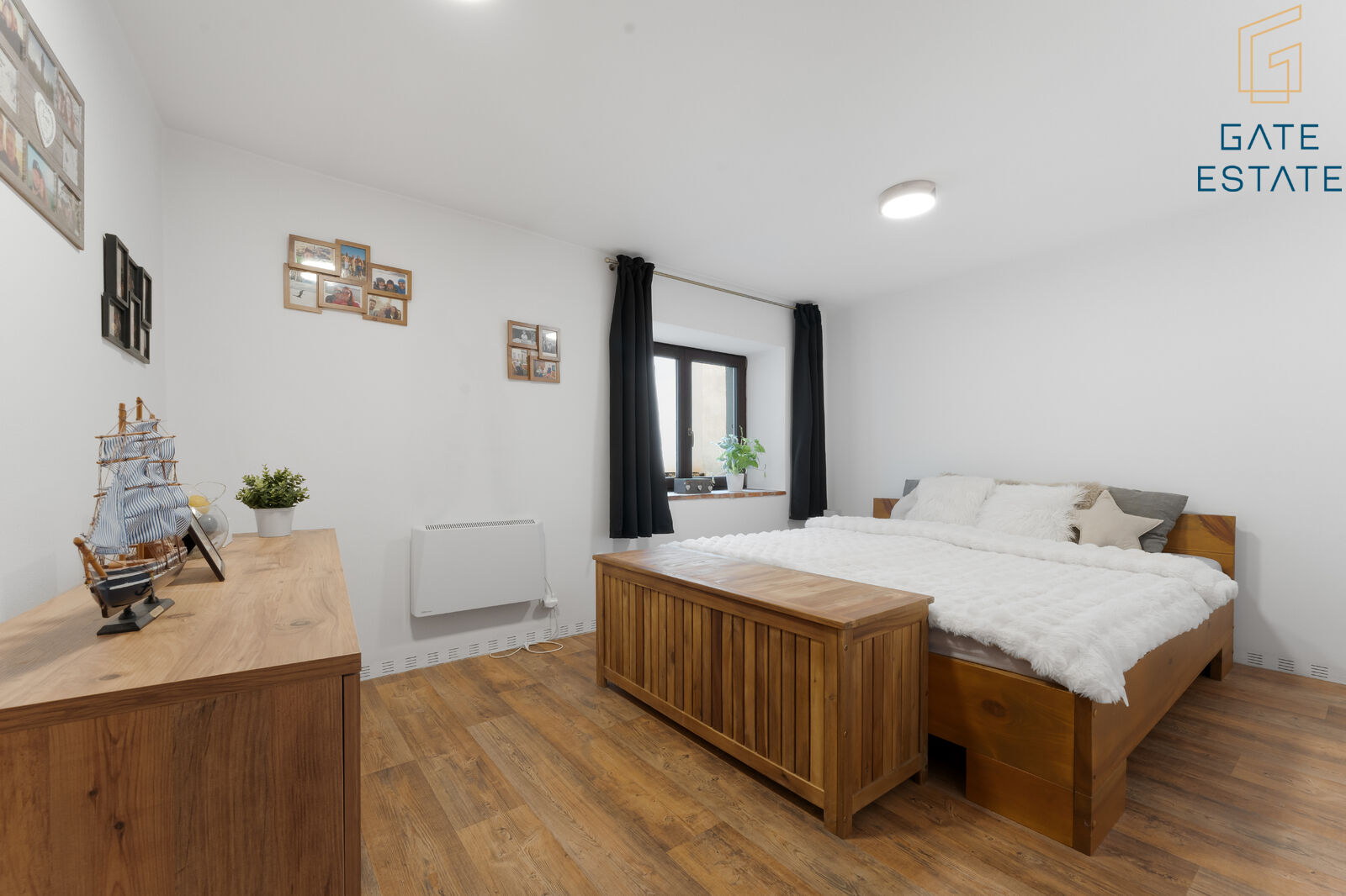 Dispozice domu je řešena prakticky - do všech pokojů se vstupuje z centrální chodby, přičemž obývací pokoj je přístupný přímo ze vstupní předsíně. Díky tomu je oddělena klidová část domu od hlavního obytného prostoru a celý dům působí logicky a funkčně (viz půdorys). Interiér je navíc vkusně sladěný a působí útulně. Kombinace dřeva, světlých tónů a moderních prvků vytváří prostor, ve kterém se budete cítit dobře od prvního okamžiku.