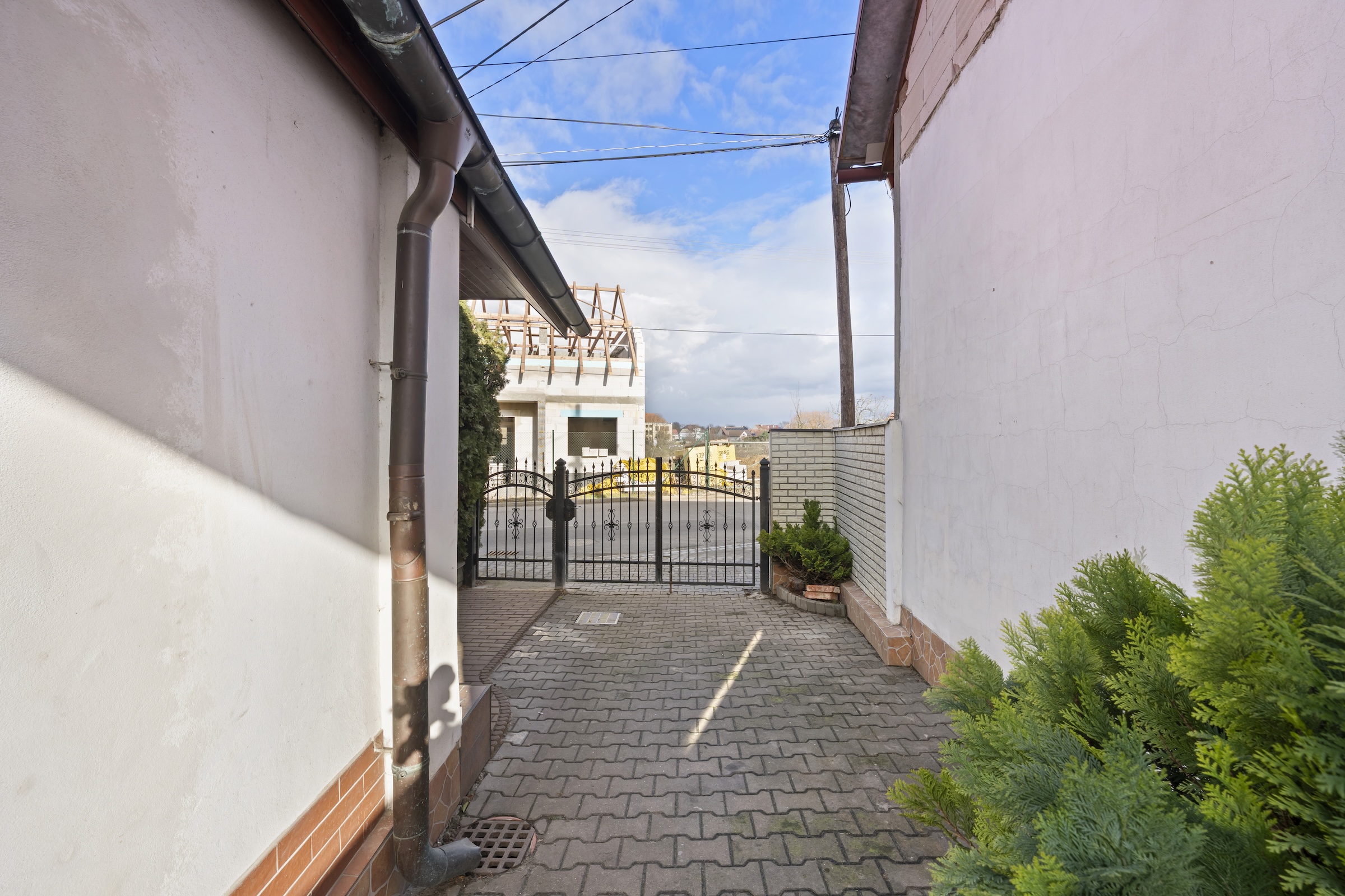 Vstup na pozemek je z obecní komunikace přes kovanou bránu, za kterou se nachází parkovací stání pro osobní automobil.