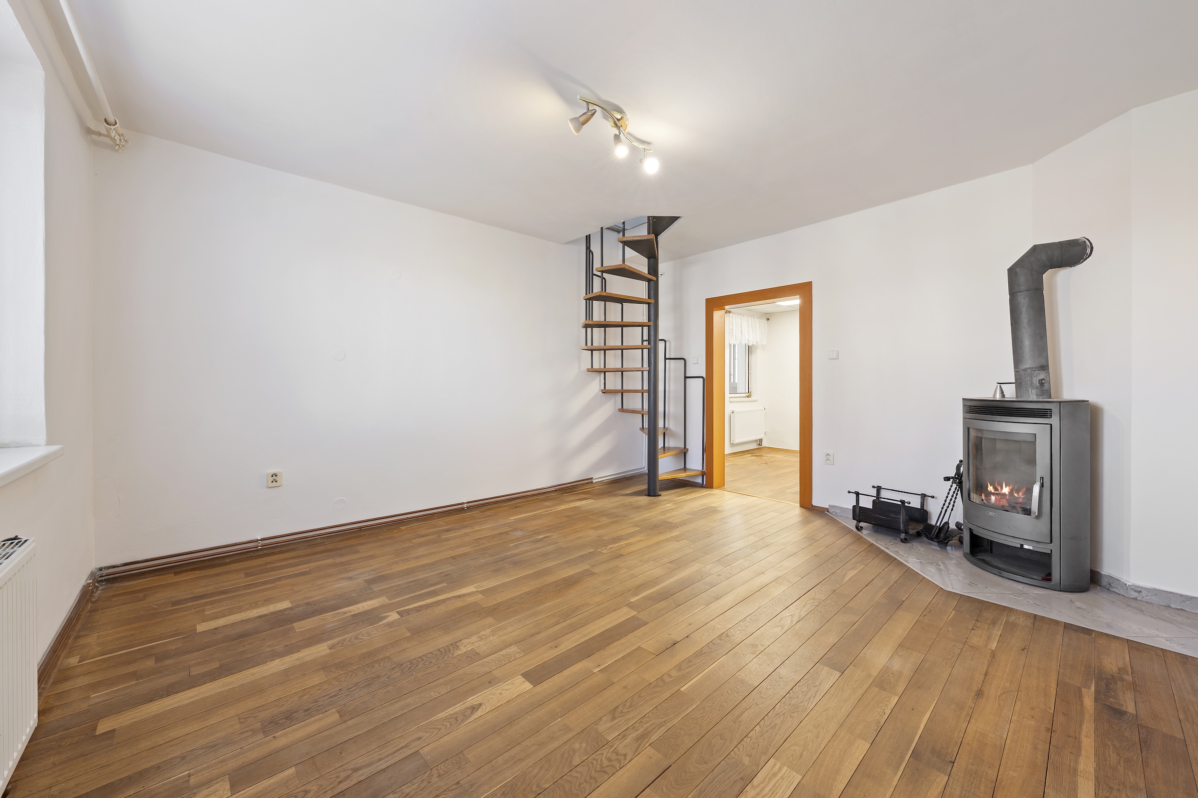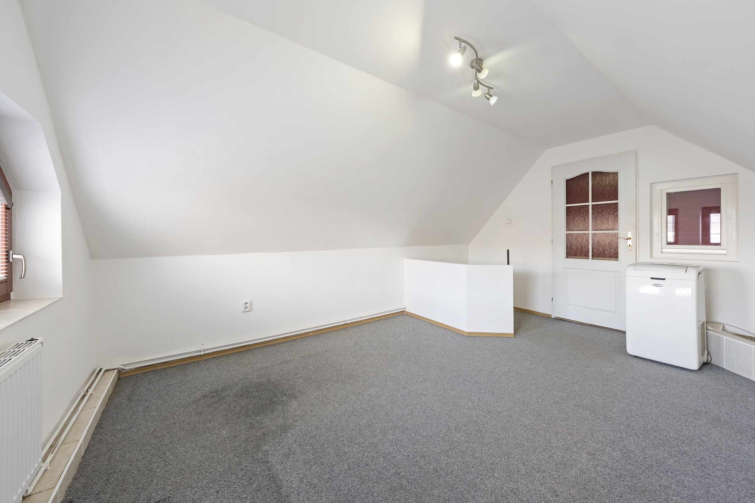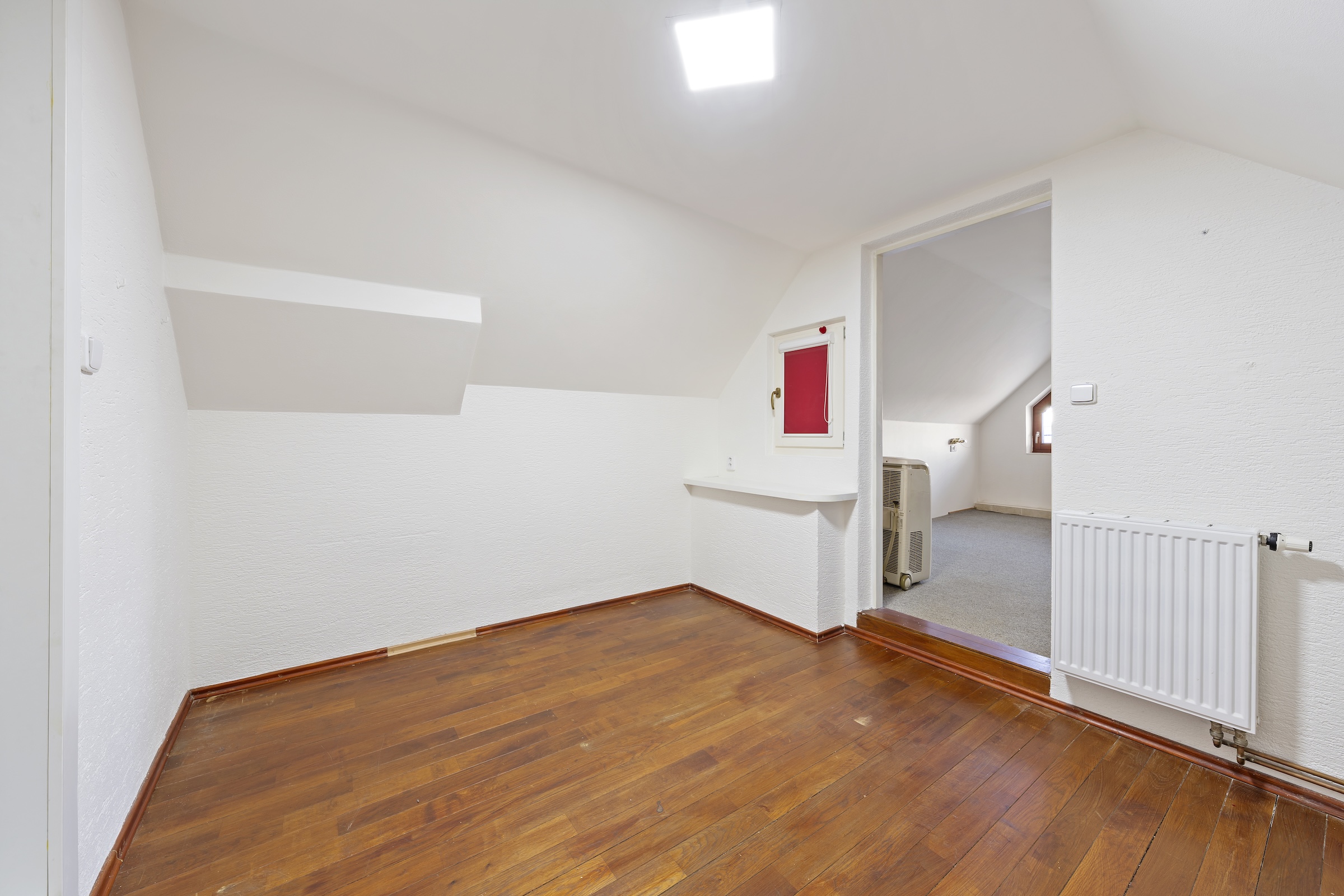 Odtud vede točité schodiště do podkroví, kde se nachází další místnost vhodná například jako ložnice, pracovna nebo pokoj pro hosty. Na ni navazuje další prostor, který lze využít například jako šatnu nebo menší pokoj.